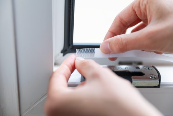 Das Fliegengitter mit der Andrückhilfe an das Befestigungsband andrücken.