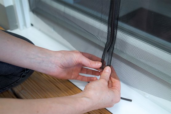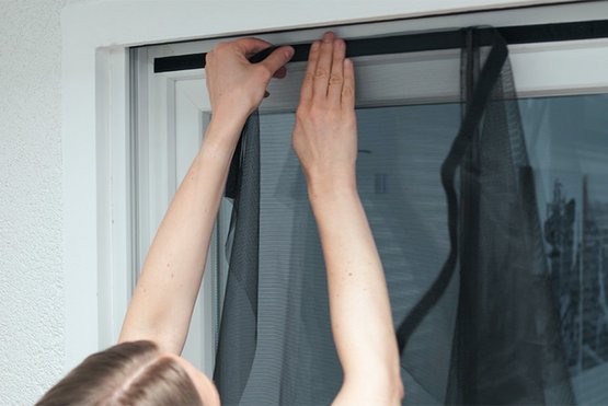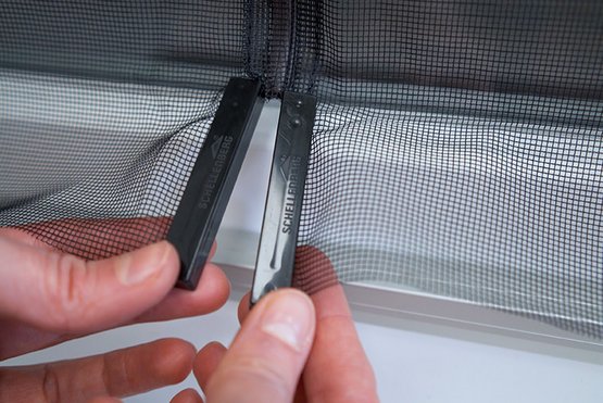 Zum Schluss noch die beiden Magnetblöcke bündig zusammenbringen, sodass sie sich anziehen und unten im Freiraum auf das Gewebe bringen. Mit den beiliegenden Clipsen befestigen und dein Insektenschutz-Magnetvorhang ist einsatzbereit.