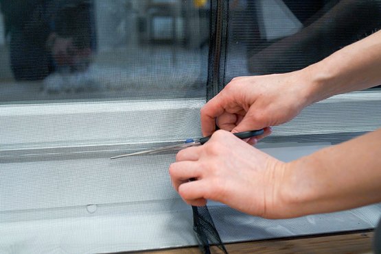 Die beiden Insektenschutz Gewebeteile ausrichten (Durchgang mittig) und auf das Mikroplastband oder Befestigungsband (oben, links und rechts) aufsetzen.
