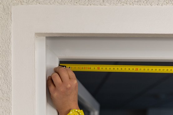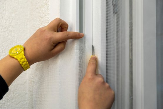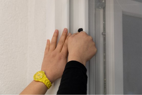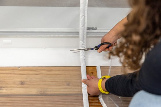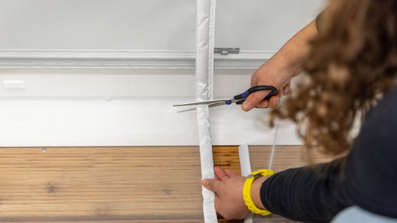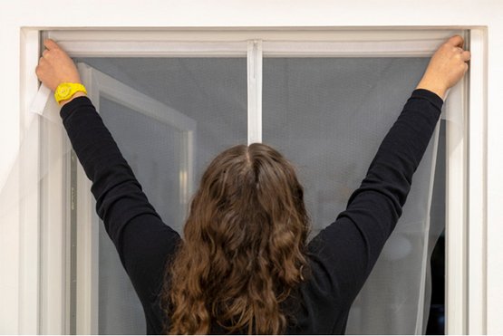 Den Insektenschutzvorhang ausrichten (Durchgang mittig und geschlossen) und auf das Mikroplastband (oben, links und rechts) befestigen.