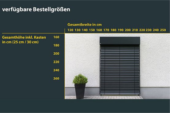 Der Raffstore-Express ist in Bestellbreiten von 120 bis 250 cm und in Bestellhöhen von 160 bis 260 cm verfügbar.
