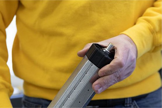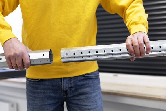 Nun kannst du die Kombination mit einer Metallsäge millimetergenau kürzen. Im Fall einer Motorisierung platzierst du den Rollladenmotor in der Achtkantwelle und nimmst bei Bedarf Kürzungen an der Verlängerungswelle vor.