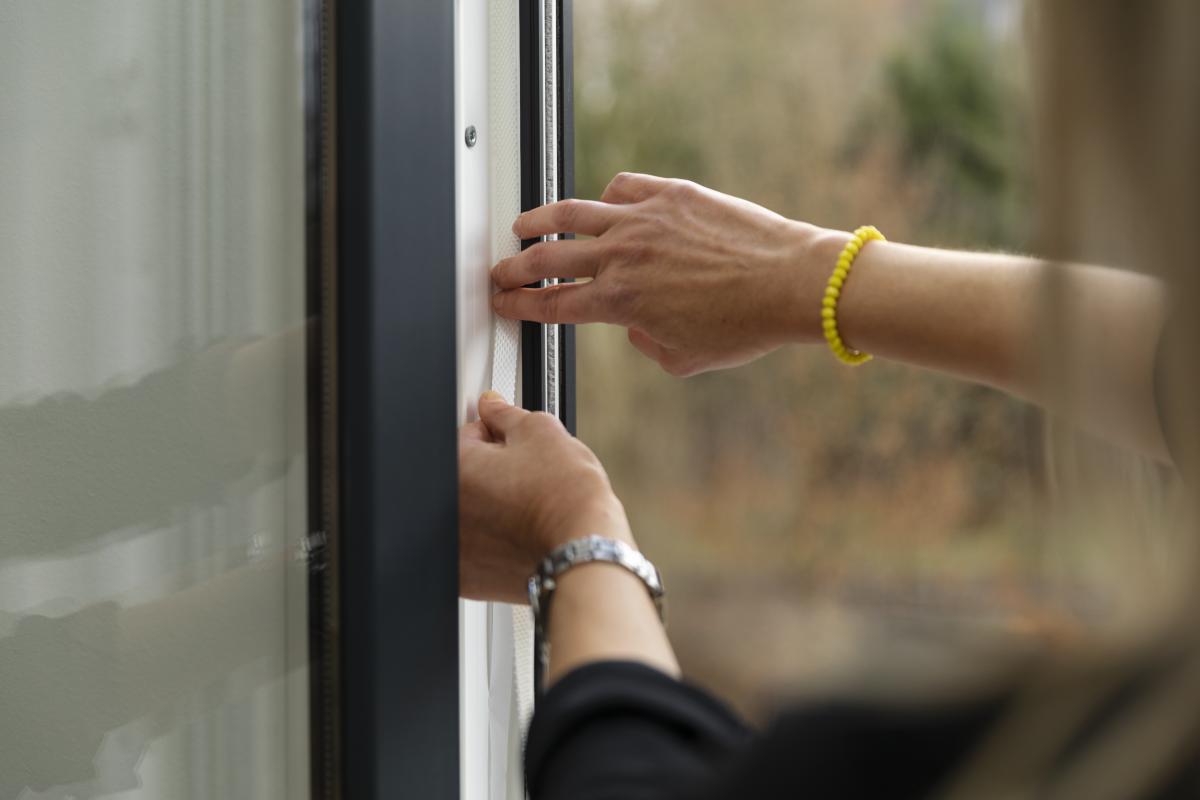 - Fliegengitter ausrichten und an das Befestigungsband drücken.