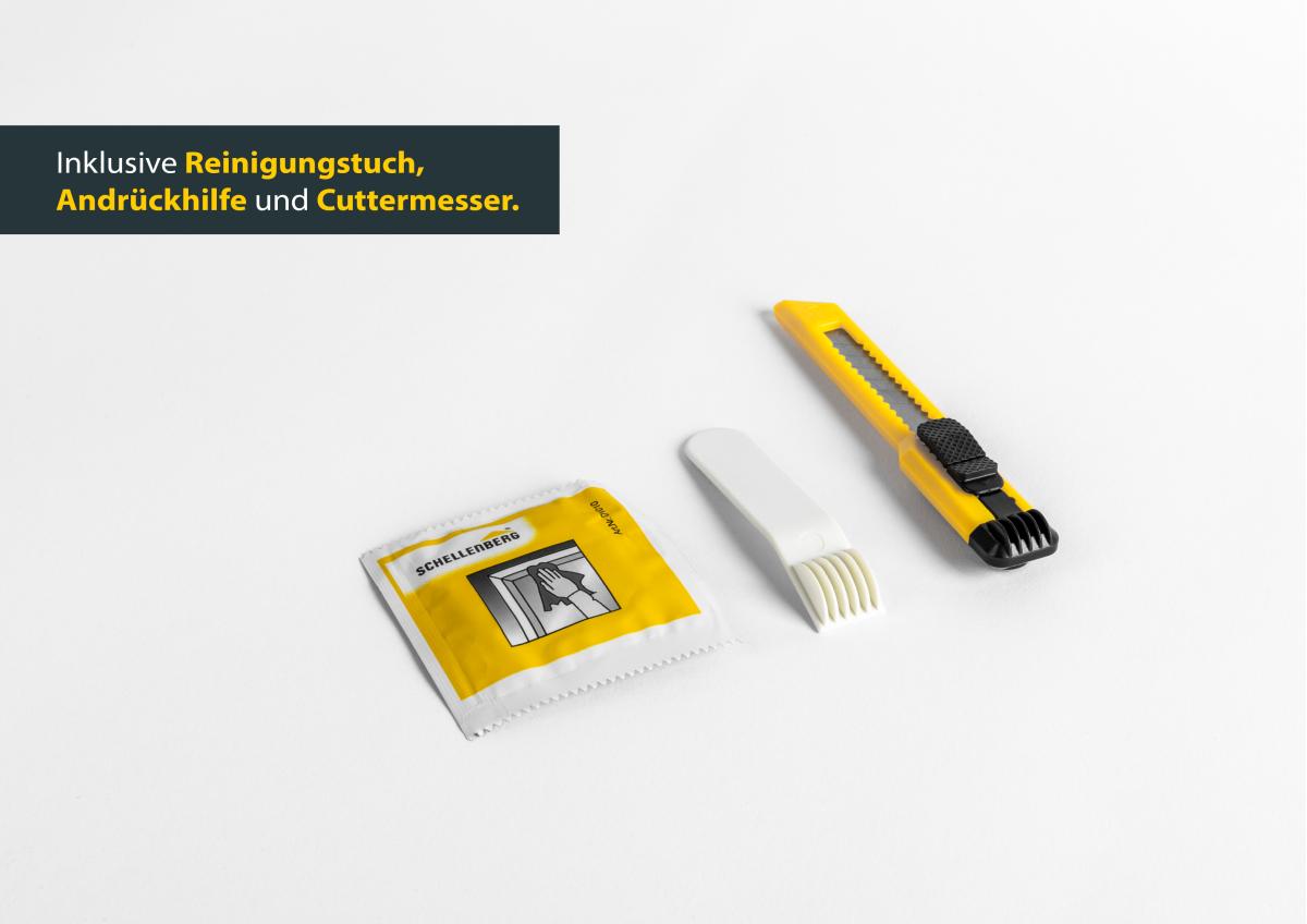 - inklusive praktischer Montagehilfe, Cuttermesser und Reinigungstuch