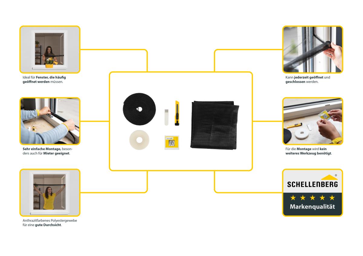 Für die Montage ganz ohne Bohren und Schrauben liegt dem Komplett-Set bereits alles bei, was du benötigst: vom Befestigungsband bis hin zum Cutter-Messer, Reinigungstuch und der Andrückhilfe für das Gewebe. Du kannst das SIMPLY OPEN Fliegengitter 130 x 150 cm individuell kürzen, genauso, wie du es brauchst. Das Insektenschutz-Gewebe in Anthrazit ist UV-stabilisiert und waschbar bis 30°C. Einfach praktisch und zuverlässig.