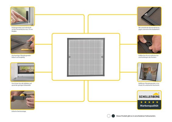 Die Schellenberg Insektenschutz Rahmensysteme schützen wirksam und zuverlässig vor Mücken, Fliegen, Insekten und anderen ungebetenen Gästen. Sie bestehen aus einem stabilen Aluminium-Rahmen und einem hochwertigen Fliegengitter aus hochwertigem, anthrazitfarbenen Fiberglasgewebe für eine besonders gute Sicht. Dank der umlaufenden Bürstendichtung haben auch kleinere Kriechtiere keine Chance auf Einlass.