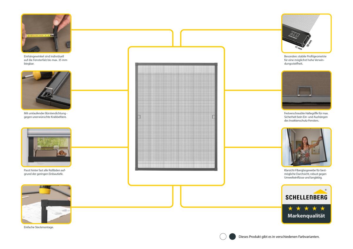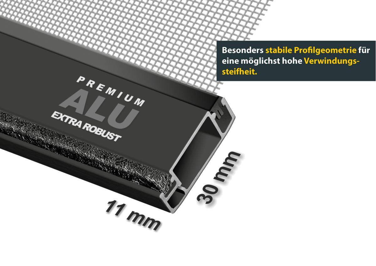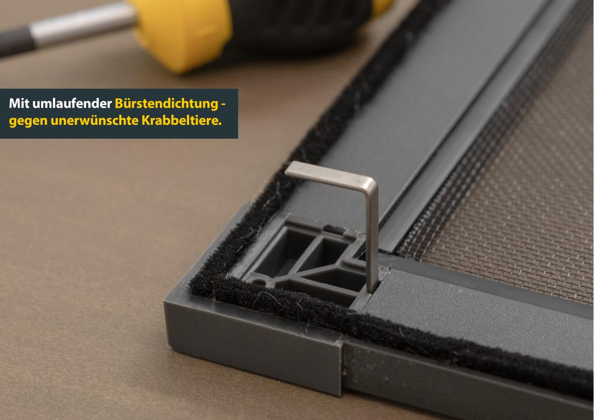 Die PREMIUM Insektenschutz-Lösungen mit langlebigem Klarsicht-Fiberglas-Gewebe im stabilen Aluminium-Rahmen, halten Wohnräume zuverlässig frei von Insekten wie Fliegen, Mücken, Wespen und Kriechtieren. Neben der hervorragenden Durchsicht ermöglicht das Premium Gewebe eine bis zu 30% bessere Luftzirkulation sowie eine bis zu 40% bessere Durchsicht im Vergleich zu herkömmlichem Fiberglas-Gewebe. Zudem ist das Gewebe UV-stabil, reißfest und abwaschbar. Eine umlaufende Bürstendichtung sorgt für zusätzlichen Schutz gegen Kriechtiere.