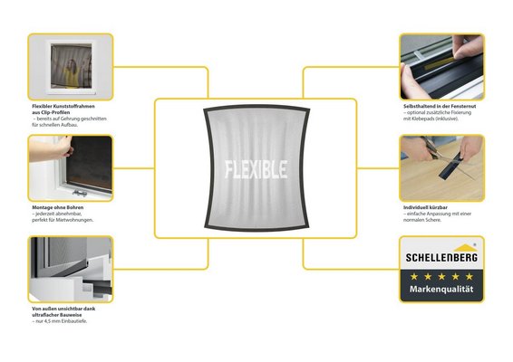 Die flexiblen Kunststoff-Rahmen sind bereits auf Gehrung geschnitten und müssen nur noch verbunden werden. Danach wird das Insektenschutzgewebe in den Rahmen geklemmt und schon kann der Rahmen in das Fenster gehängt werden. Die Montage erfolgt ganz ohne Bohren - ist also ideal für Mietwohnungen geeignet.