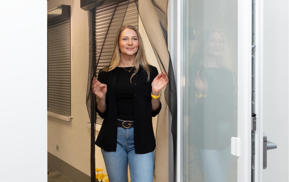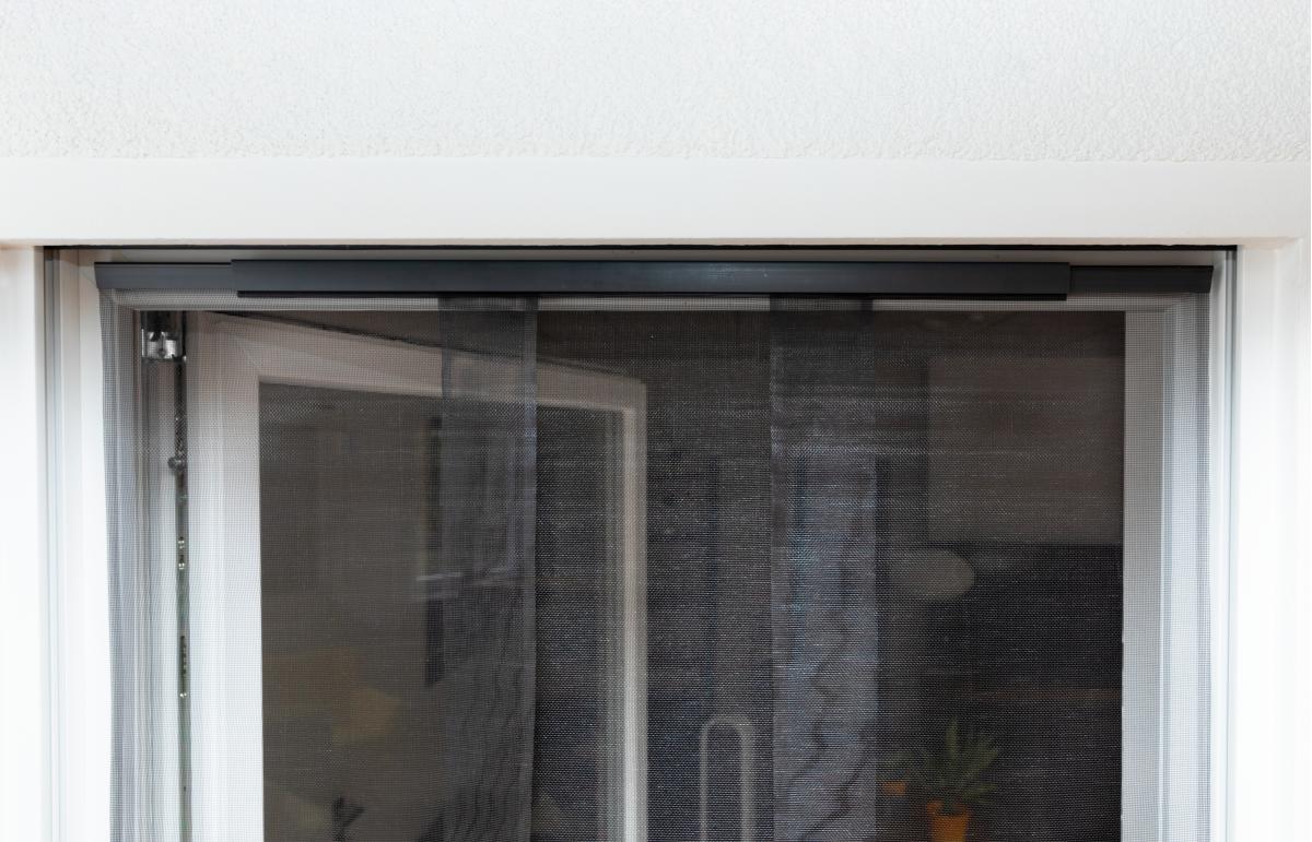 - Teleskopschiene des Insektenschutz-Vorhangs am Klettband befestigen.