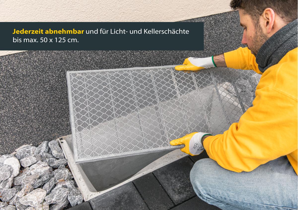 Diese hochwertige Lichtschacht-Abdeckung macht lästiges Reinigen von Keller- und Lichtschächten überflüssig. Das sehr hochwertige Edelstahl-Gewebe verhindert, dass Blätter, Schmutz, Insekten, Spinnen oder Nager in den Schacht gelangen. Die Abdeckung ist begehbar und witterungsbeständig. Das benötigte Befestigungsmaterial sowie eine ausführliche Montageanleitung sind im Lieferumfang enthalten. Das Komplettset ist für Kellerschächte bis max. 50 x 125 cm geeignet.