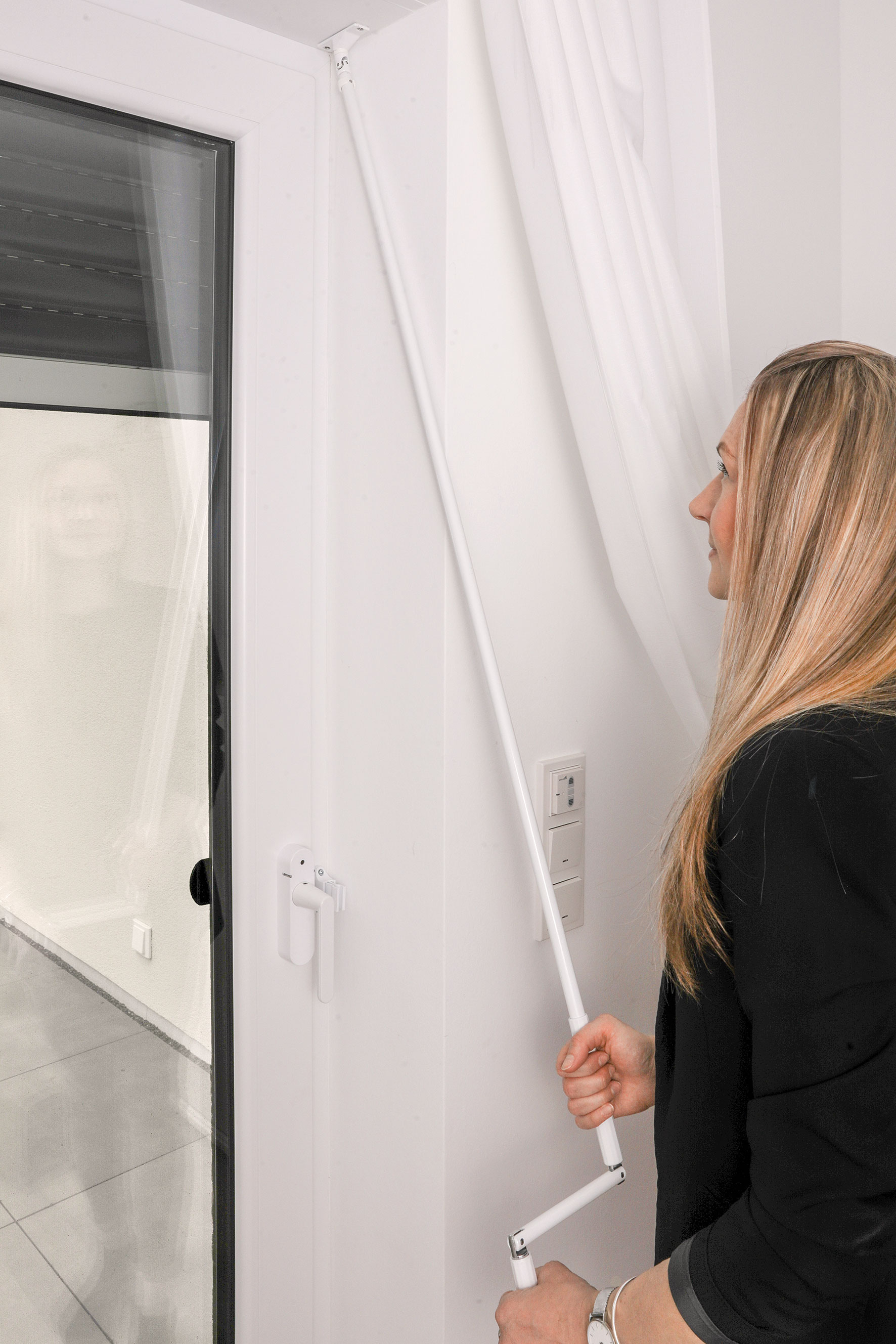 Darüber hinaus eignen sich diese Kurbelstangen auch optimal für Dachflächenfenster. Dank des schwenkbaren Gelenklagers lässt sich die Stange unabhängig von der Dach- bzw. Wandneigung in eine vertikale Position bringen und damit komfortabel und ohne erhöhten Kraftaufwand bedienen.