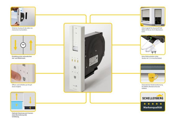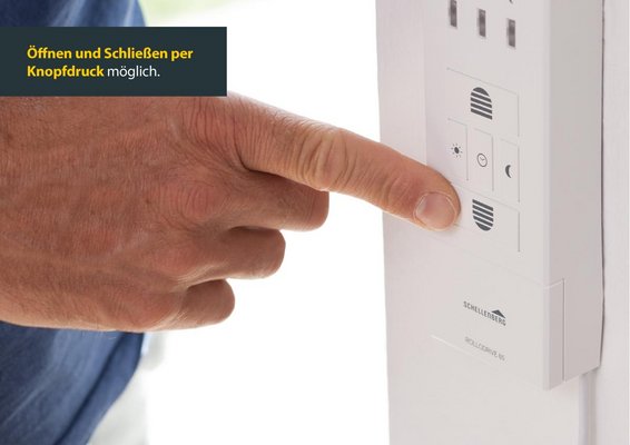 Unser Rollladengurt-Antrieb ROLLODRIVE 105 PLUS von Schellenberg öffnet und schließt Rollläden automatisch zu programmierten Uhrzeiten oder jederzeit ganz bequem per Knopfdruck. Zudem verfügt er über eine Astrofunktion, die die Schließzeiten automatisch an die örtlichen Sonnenauf- und Sonnenuntergangzeiten anpasst. Durch sein geschlossenes Getriebe arbeitet er leise und laufruhig und bewältigt Rollläden bis zu 10,0 m² Fläche. Die Einstellung der Zeitautomatik wird über fünf eindeutig zuordenbare Tasten und das großflächige Display vorgenommen - der Installationsassistent führt durch den Programmiervorgang. Mit seiner Hilfe werden nicht nur bequem die Endpunkte und die Öffnungs- und Schließungszeiten des Rollladens festgelegt - es gibt auch weitere Einstellungsmöglichkeiten dieser hochwertigen Steuerung, zum Beispiel Einstellungen für jeden einzelnen Wochentag. Mit der Astrofunktion werden die Schließzeiten automatisch festgelegt, abhängig von Datum und Postleitzahl. Wird sie genutzt, lassen sich die Schließungszeiten um +/- 60 Minuten variieren.