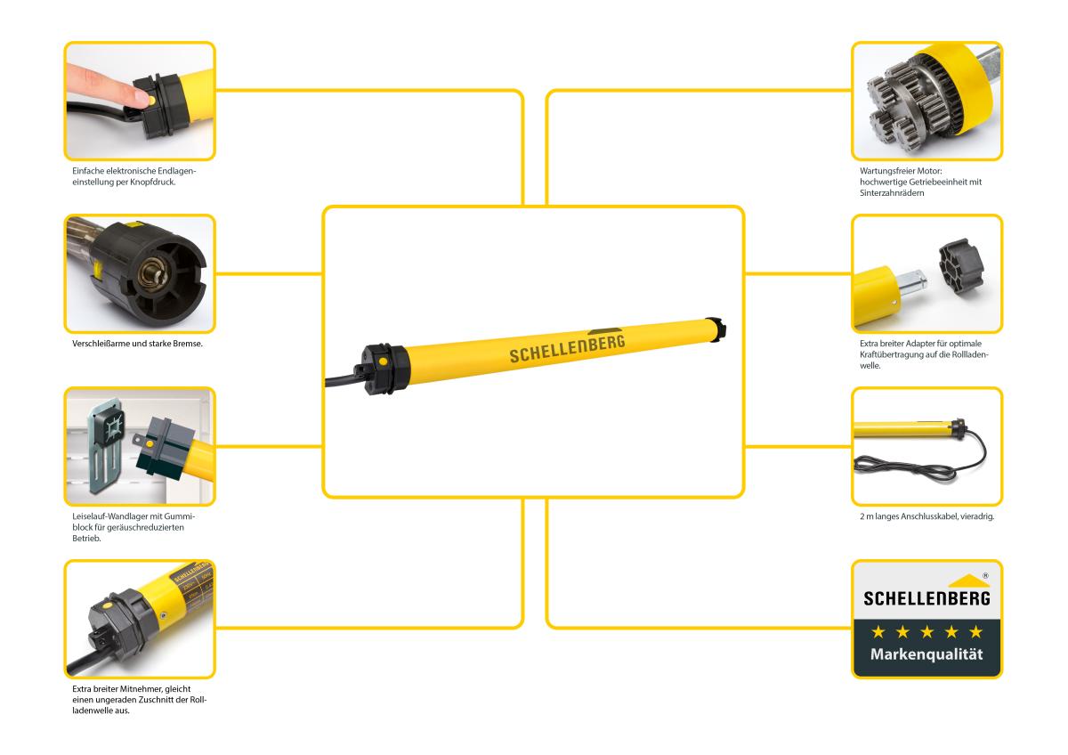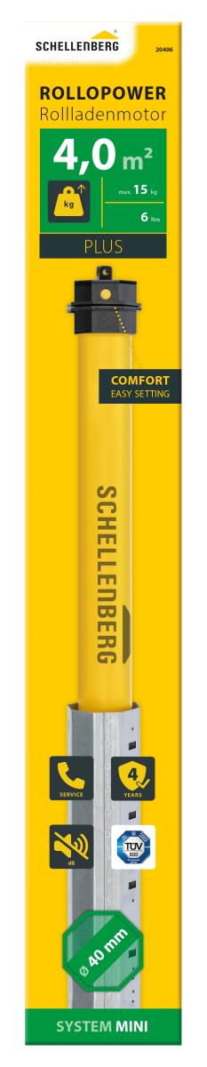 Mit einer max. Zugkraft von 15 kg und einem Drehmoment von 6 Nm ist der Rohrmotor Mini PLUS 6 von Schellenberg ein kraftvoller Rollladenmotor der Sorte PLUS, passend für Rollladenwellen mit 40 mm Durchmesser. Dies macht ihn zu einem starken Antrieb für Kunststoff-Rollläden mit einer Fläche von bis zu 4,0 m². Dieser Wert variiert je nach Material, Schwere und Bauart des Rollladens (Die maximale Zugkraft von 15 kg sollte nicht überschritten wird). Zum Lieferumfang gehört neben dem Motor auch der passende Adapter.