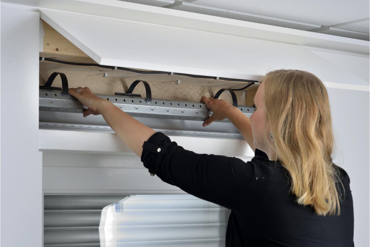 Für den leiseren Lauf und zum Schutz des eingebauten Rollladenmotors vor dem Zerkratzen ist die Achtkantwellen-Einhängeklammer MINI zusammen mit der Rollladenaufhängung MINI im Einsatz.