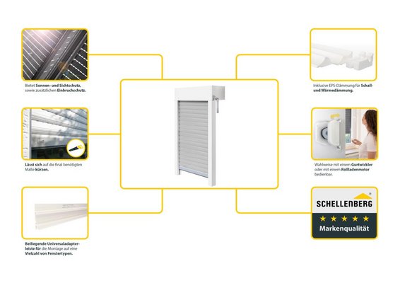 Moderne Rollläden schützen nicht nur vor Sonne und Kälte, sondern auch vor neugierigen Blicken und Einbrechern. Der Aufsatzrollladen ist die ideale Wahl, wenn bei der Renovierung oder beim Neubau neue Fenster eingesetzt werden. Er bildet mit dem Fenster eine Einheit. Dabei kann der Aufsatzrollladen bei einem passgenauen Fenster direkt oder bei kleineren Fenstern nach einer Breiten- oder Höhenkürzung montiert werden. Der Aufsatzrollladen wird oben auf dem Fenster montiert und zusammen mit dem Fenster in die Maueröffnung eingesetzt. Dank der Universaladapterleiste passt unser Aufsatzrollladen auf eine Vielzahl von Fenstertypen aus Kunststoff. Zusammen mit den ebenfalls beiliegenden Metallverbindern sorgt die Universaladapterleiste für den perfekten Halt am neuen Fenster.