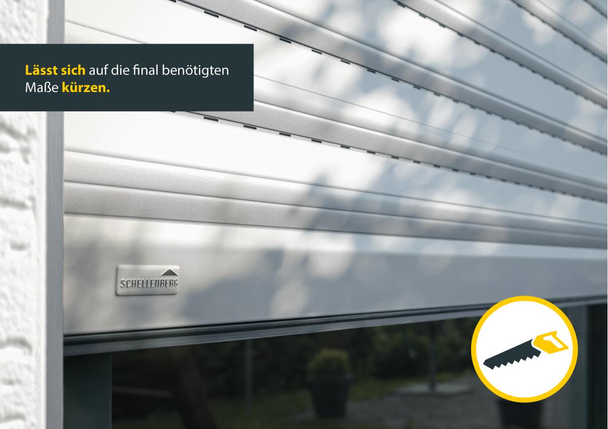 - Rollladenwelle, EPS-Dämmung, Kastenelemente, Endleiste und Rollladenpanzer auf das erforderliche Breitenmaß kürzen.