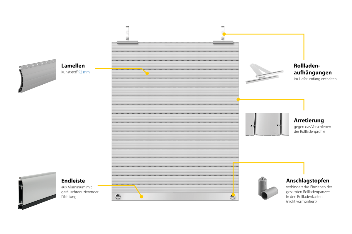 - Rollladenpanzer inkl. Aluminiumum-Endleiste, Rollladenaufhängungen und Anschlagstopfen