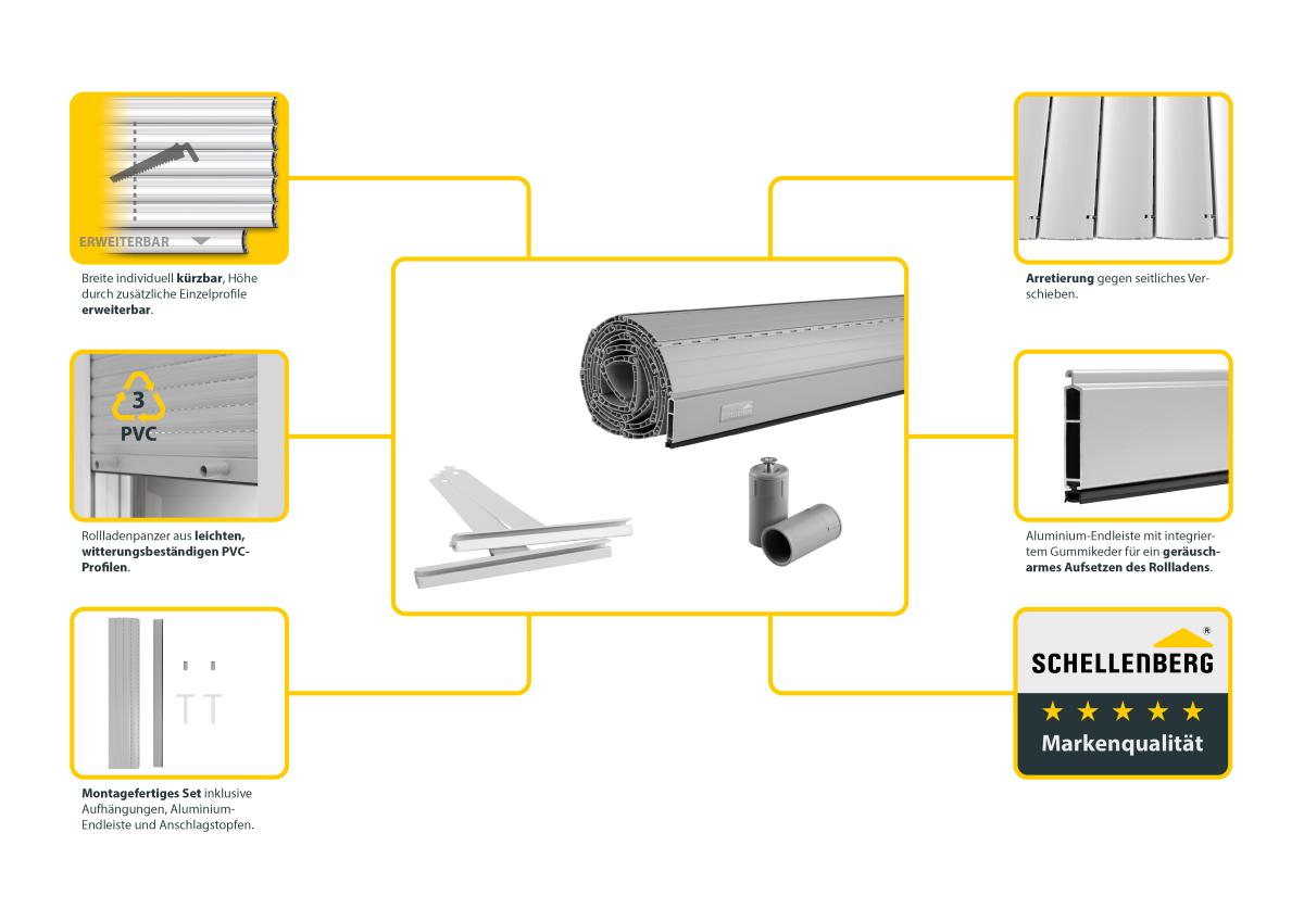 Dieses Rollladenpanzer Komplett-Set von Schellenberg eignet sich ideal für den Austausch des Rollladenpanzers bei Renovierungen sowie für den Einbau eines Rollladens in Neubauten. Der graue Rollladenpanzer für das Rollladensystem MAXI hat eine Breite von 90 cm und eine Höhe von 110 cm. In der Breite kann der Panzer individuell gekürzt und in der Höhe mit zusätzlichen Einzelprofilen erweitert werden. Die Höhe der einzelnen Rollladenprofile beträgt bei diesem Rollladenpanzer 52 mm. Dieses Schellenberg Komplett-Set ist bereits vormontiert und beinhaltet neben dem Rollladenpanzer auch eine Aluminium-Endleiste mit Gummikeder für sanftes Aussetzen und gegen Festfrieren, zwei passende Rollladenaufhängungen sowie zwei Anschlagstopfen. Eine Arretierung sichert die Rollladenprofile gegen seitliches Verschieben.