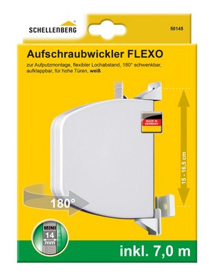 Vorhandene Bohrlöcher des alten Gurtwicklers einfach weiterverwenden - das ermöglicht unser Aufschraubwickler MINI FLEXO. Dank der praktischen FLEXO-Befestigungsmethose ist er für Lochabstände von 15 cm bis 16,5 cm geeignet und kann einfach an der Wand oder am Fensterrahmen angebracht werden. Der integrierte Rollladengurt hat eine Breite von 14 mm und eine Länge von 7 Metern. So kann der Gurtwickler optimal bei bodentiefen Fenstern und hohen Türen eingesetzt werden.