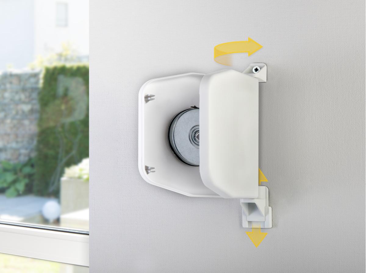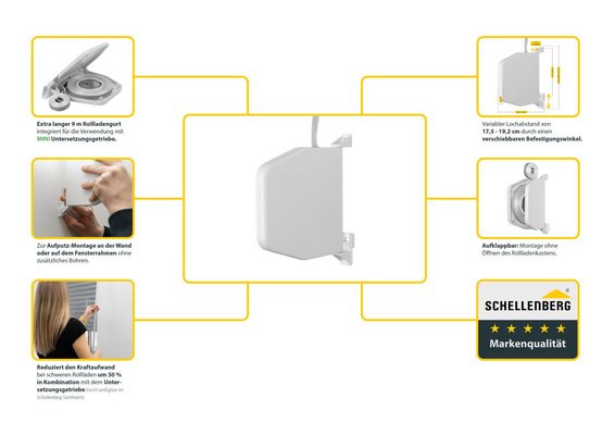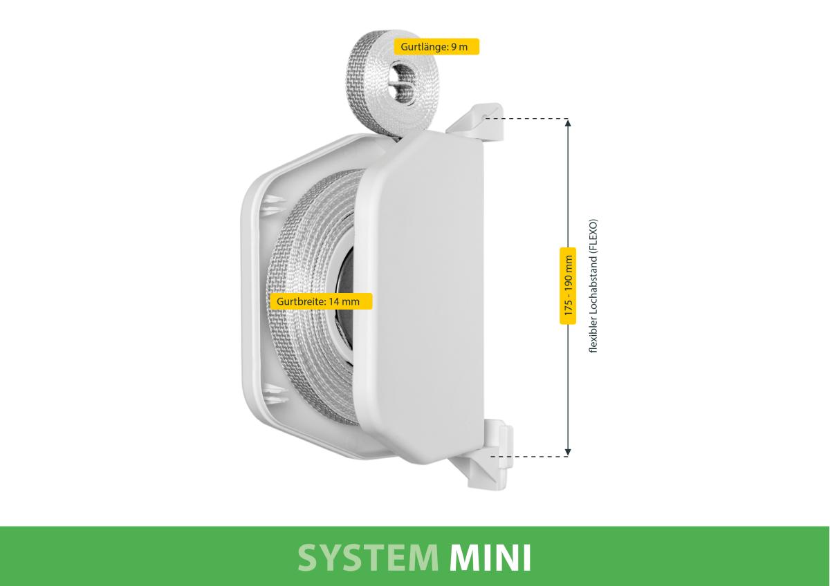 Unser Getriebegurtwickler FLEXO ist Bestandteil eines Rollladensystems MINI mit Gurt für das manuelle Öffnen und Schließen von großen Rollläden z.B. an Türen. Die schnelle und einfache Aufputz-Montage erfolgt an der Wand oder am Fensterrahmen. Dabei ist die Verwendung des bestehenden Gurtbandes möglich. Wir empfehlen jedoch den Einsatz mit dem vormontierten 9 Meter langen Gurtband. So ist der Wickler für den Einbau mit einem Untersetzungsgetriebe MINI ideal geeignet. Der Lochabstand ist variabel, von 175 mm bis 190 mm, dank des verschiebbaren Befestigungswinkels.