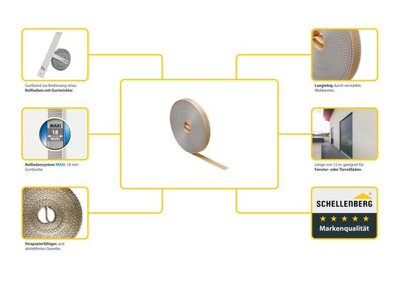 Unser hochwertiger Rollladengurt ist besonders strapazierfähig und besteht aus abriebfestem Gewebe mit verstärkten Webkanten. Dadurch ist das Schellenberg-Gurtband sehr stabil und langlebig.Dieser Rollladengurt für das Rollladensystem MAXI hat eine Breite von 18 Millimetern und eine Länge von 12 Metern. Seine Stärke beträgt 1,7 mm. Er eignet sich für Rollläden an Türen und Fenstern.