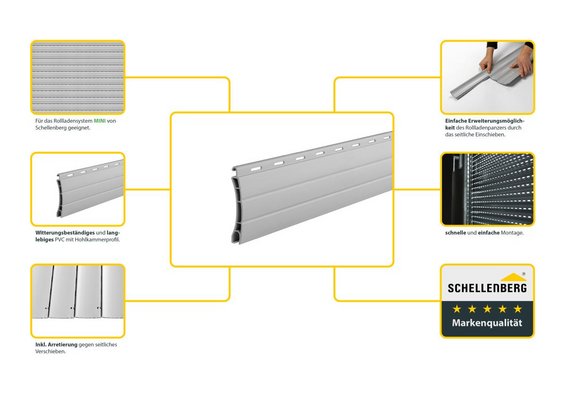 Unsere einzeln erhältlichen Rollladenprofile eignen sich für den Austausch defekter Rollladenprofile, können aber auch zur Erweiterung bereits vorhandener Rollladenpanzer genutzt werden. Das Schellenberg Rollladenprofil MINI besteht aus stabilem, witterungsbeständigem Kunststoff und ist mit einer Arretierung gegen seitliches Verschieben ausgestattet. Die Arretierung sorgt für einen reibungslosen Lauf des Rollladens in der Führungsschiene ohne lästiges Verkeilen des Panzers. Die Profil-Deckhöhe der Rollladenprofile MAXI beträgt 37 mm. Bei der Profil-Deckhöhe handelt es sich um die sichtbare Höhe des Rollladenprofils, bei komplett geschlossenem Rollladen. Ein intakter Rollladen vor Fenstern, Balkon- und Terrassentüren erhöht die Dämmwerte deines Gebäudes und schützt deine Wohnräume und Fenster gegen Hitze, Kälte, Lärm und andere Arten von Wettereinflüssen. Zudem dient ein Rollladen als zusätzlicher Einbruchschutz, da dieser in geschlossenem Zustand eine wirksame Barriere darstellt.
