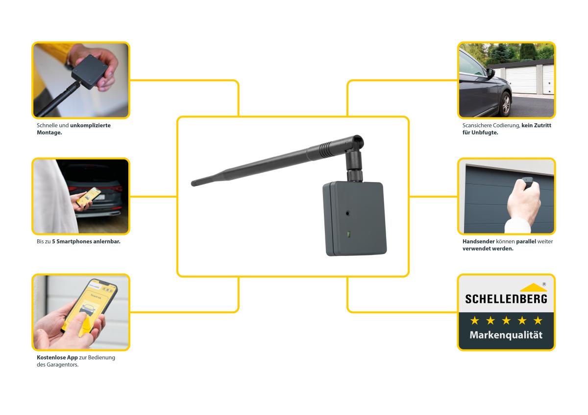 Dein Smartphone hast du immer dabei? Warum nutzt du es nicht einfach auch als praktische Fernbedienung für dein Garagentor? Unser Smartphone Garagentoröffner besteht aus einem Empfangsmodul für den Torantrieb und einer App für dein Smartphone. Mit diesen beiden Komponenten steuerst du deine Garagentor- und Außentorantriebe von Schellenberg - und auch anderer Hersteller - bequem mit deinem Handy. Der Smartphone Garagentoröffner ist für diese Torantriebe von Schellenberg geeignet: Bei unseren POWERLIFT 800N und 1000N gilt Plug & Play, und es kann gleich losgehen. Bei unseren Smart DRIVE Action, Smart DRIVE 10 und 14, POWERLIFT 550N sowie Garagentorantrieben anderer Hersteller ist ein USB Typ A Netzteil erforderlich. Bei Fragen dazu sprich gerne unseren kostenlosen Kunden-Service an.