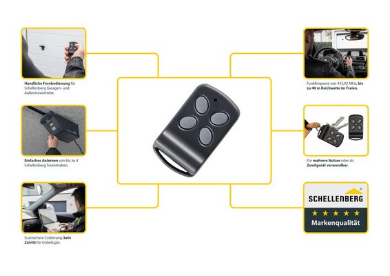 Alle Schellenberg Torantriebe der Serien Smart DRIVE SD10/SD14, SD10 /SD14 Premium, DRIVE, TWIN und SLIDE können mit diesem Handsender gesteuert werden. Mit dem Handsender lassen sich bis zu vier Torantriebe gleichzeitig bedienen. Das Anlernen der Torantriebe von Drehtoren, Garagentoren oder Schiebetoren erfolgt problemlos und schnell, der Handsender funktioniert dann über eine Distanz von bis zu 40 Metern im Freien.