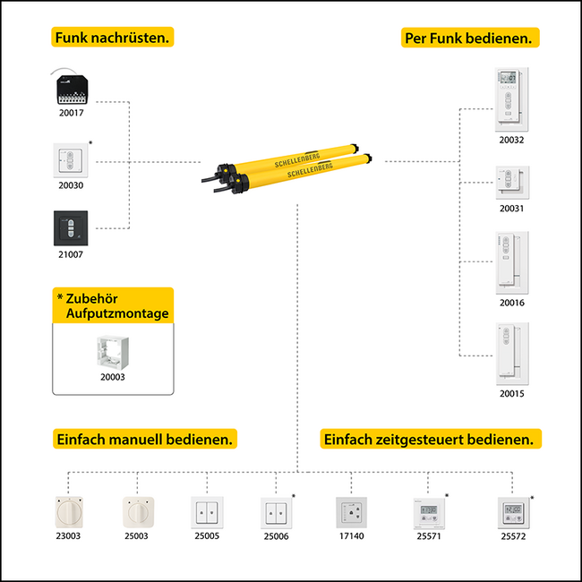 Rollladenmotoren STANDARD und PLUS steuerst du mit diesen Bedienelementen und du kannst sie auch später noch mit Funk erweitern: