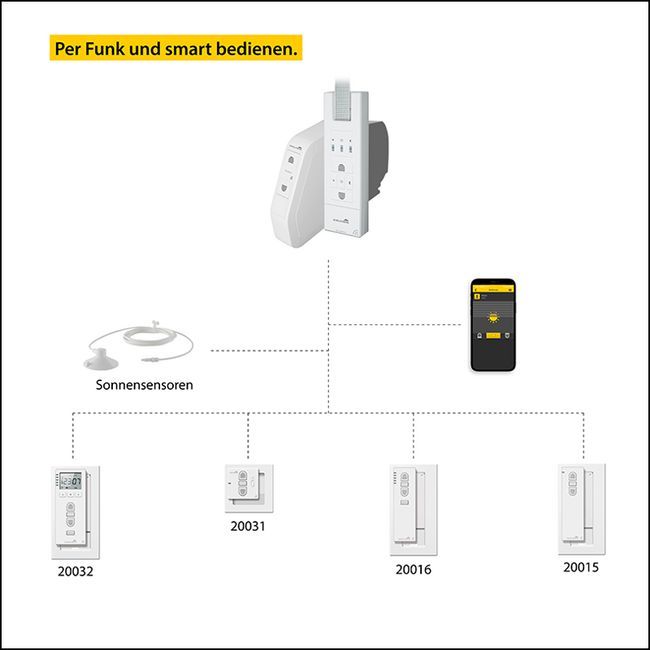 Elektrische Gurtwickler steuerst du direkt am Gerät, per Sonnensensor und funkfähige Modelle zusätzlich hiermit: